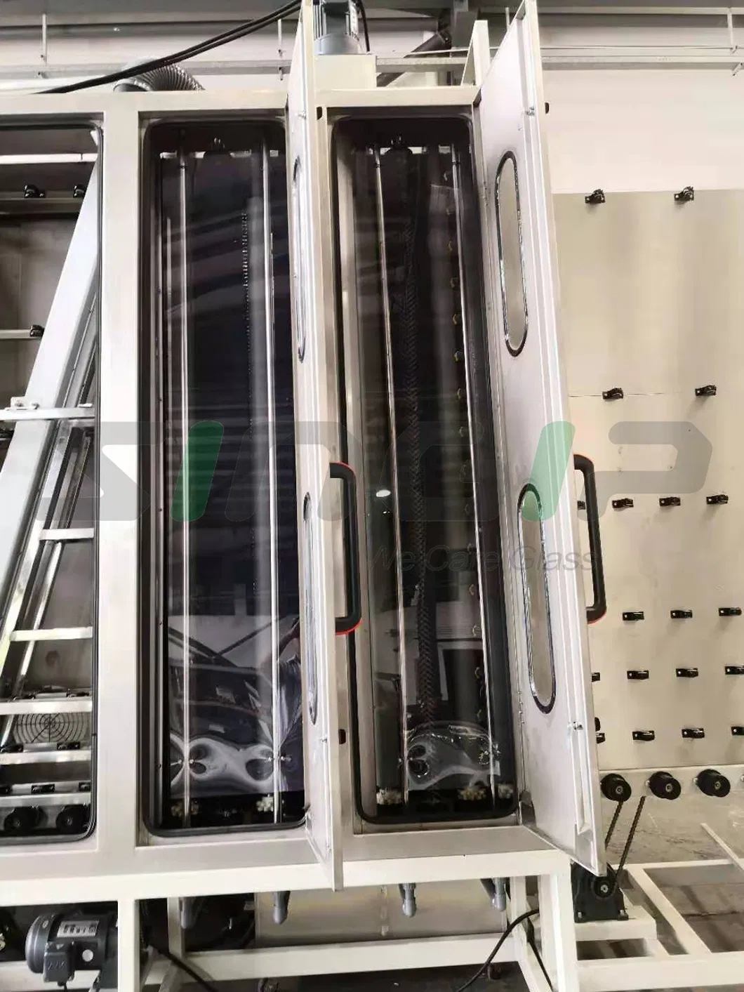 Vertical Glass Washing Machines are configured with separate areas of the machine being dedicated to washing and another for drying. Vertical washers are typically used for insulated glass production processes. The machine uses high-quality brushes to wash the glass sheet before it goes through the dryer. Vertical washers are common in glass factories that have a limited amount of space.